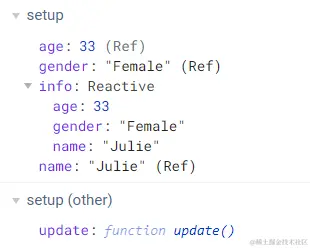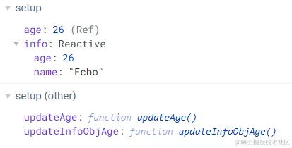 从上面的代码中,我们可以看到,age 属性是使用 toRef 函数转换的具有响应式的 ref 属性,当我们更新时,使用 reactive 定义的响应式对象 info 中的 age 也会随着更新。