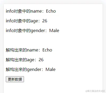 - 接着,使用 toRefs 函数将 info 对象转换为多个独立的响应式引用对象。然后通过解构赋值,把 name、age 和 gender 三个响应式引用对象分别赋给了相应的变量。