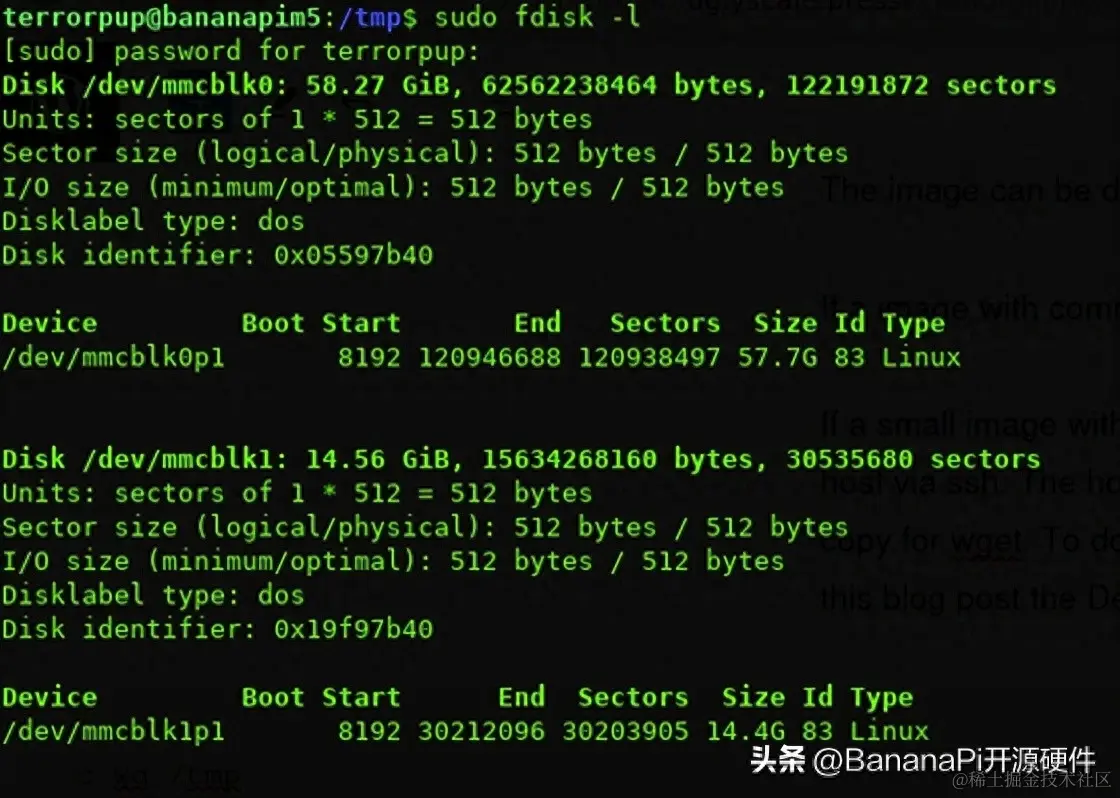 镜像解压后,需要找到eMMC 。 这可以通过运行 fdisk 并列出存储来完成,如果未选择正确的存储,SD 卡可能会被覆盖。在下图中,显示 SD 卡位于mmcblk0上,eMMC位于mmcblk1上。这很重要,因为下一个命令将覆盖