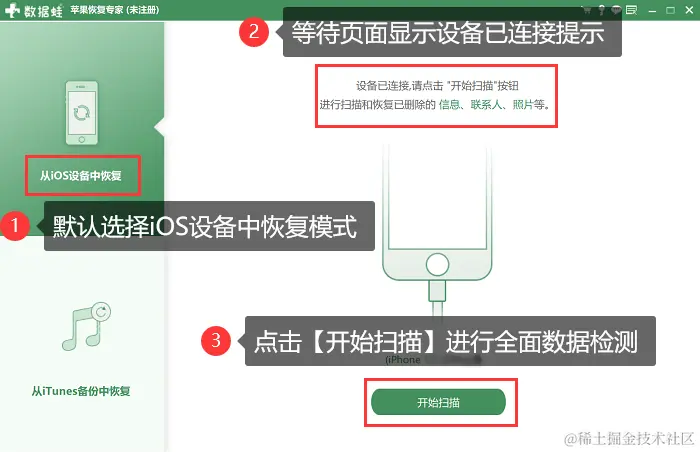 步骤1:打开数据蛙苹果恢复专家,把iPhone手机用数据线连接到您的电脑。