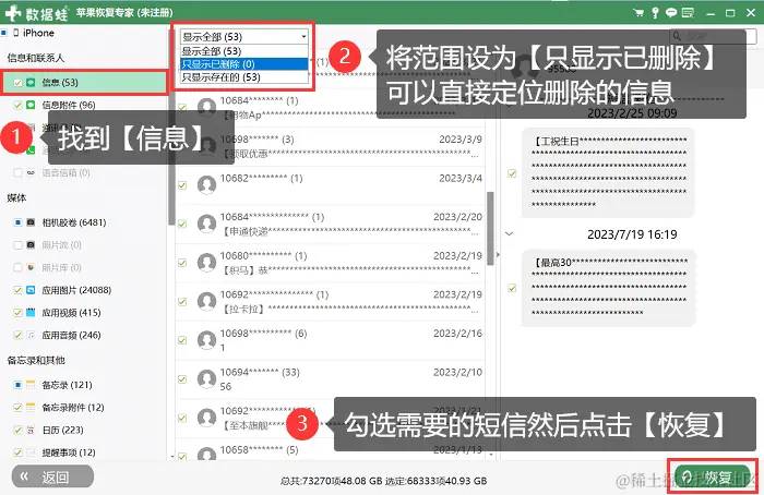 步骤2:选择您想要恢复的误删短信,勾选完成后点击右下角的【恢复】按钮即可,返回【所有信息】就可以看到短信恢复回来了。