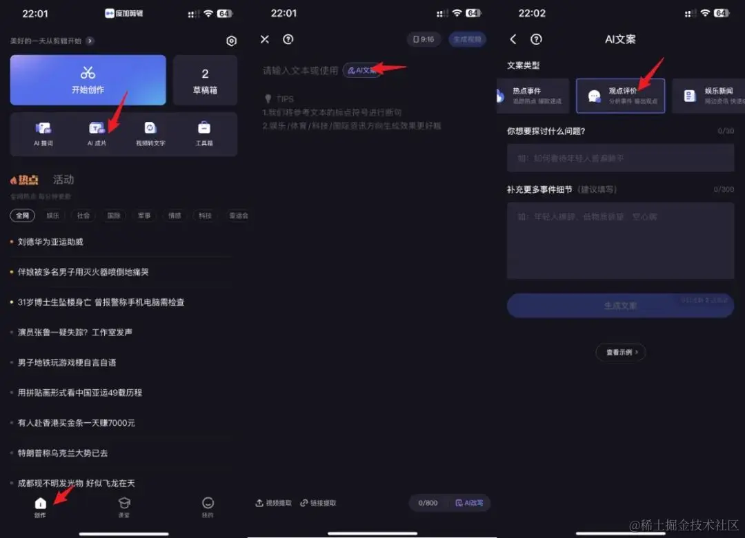 进入首页(图1)->AI创作(图2)->AI文案(图3)-->选择文案类型(图4)-->生成文案(图5)--> 填入正文->生成视频(图6)