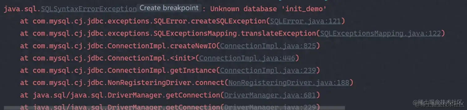 那么如果MySQL中init_demo的库并不存在,Spring Boot还尝试连接上述地址的话,就会抛出SQLException异常: