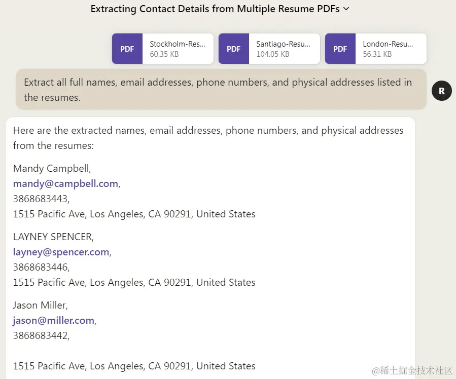 利用 ChatGPT 和 Claude 2 强大的自然语言能力,我们可以提取 PDF 文档中比较关键而零碎的信息,比如联系方式。我手头上有三份简历模板 (纯属虚构),现在要提取求职人员的联系方式,包括姓名、邮箱、电话和居住地址。因为涉及到多个 PDF,交给 Claude 2 更方便。提示词如下: