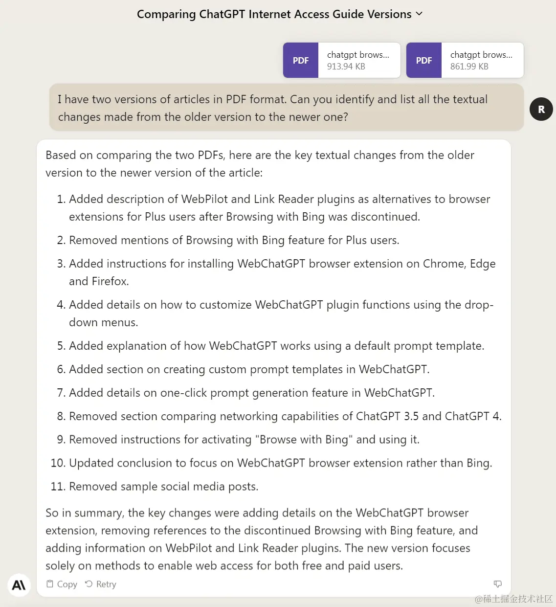 Prompt: I have two versions of articles in PDF format. Can you identify and list all the textual changes made from the older version to the newer one? (我有两个版本的 PDF 格式文章。您能否识别并列出从旧版本到新版本的所有文字改动?)