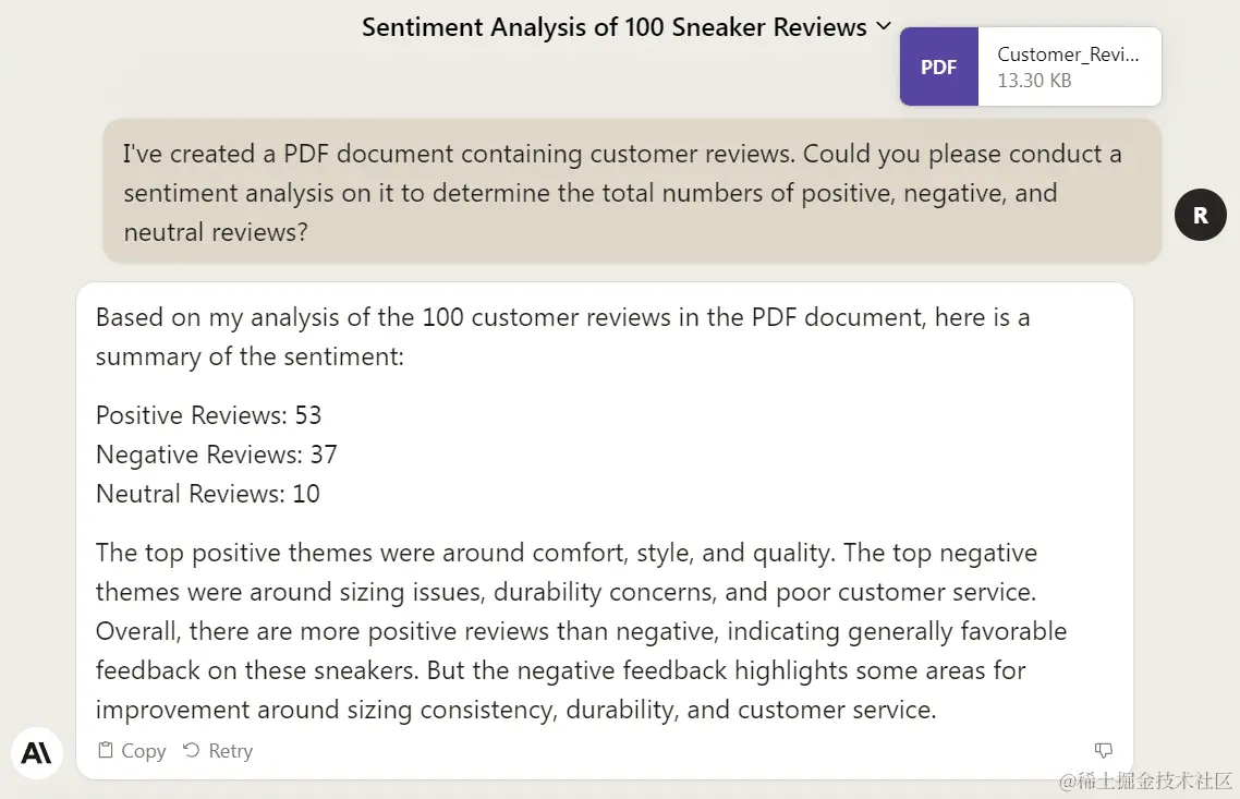 ChatGPT 和 Claude 2 强大的自然语言处理能力 (NLP) 也可以用来分析文本中的情感,无论是正面、负面还是中性。 它可以帮助用户更好地理解 PDF 中文本的整体基调或情感。这个功能在学术研究、市场调查、商业提案等场景中非常有用。
