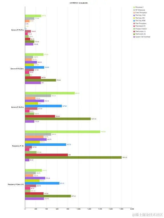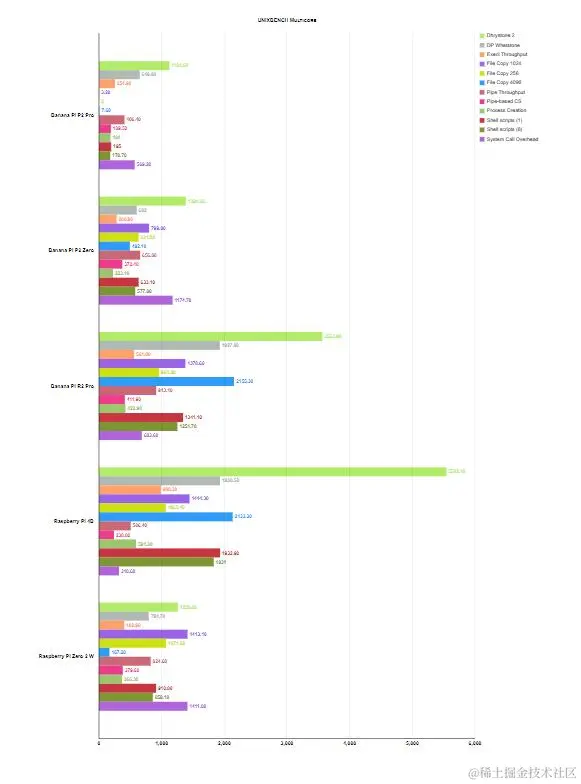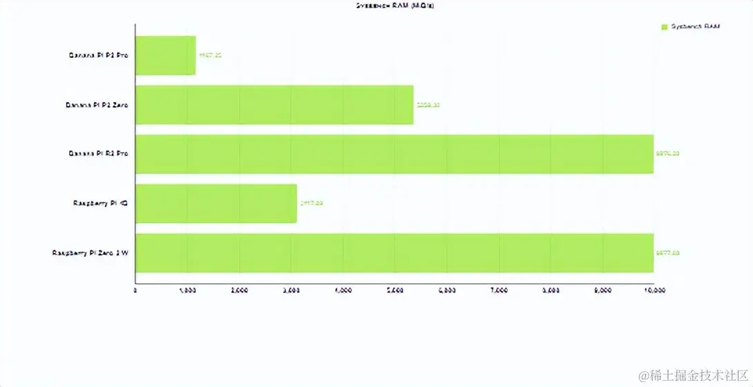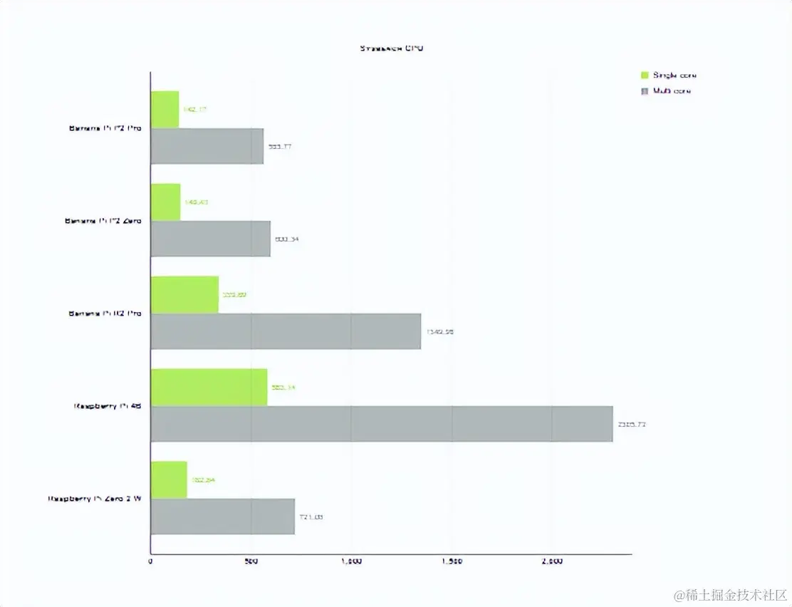 Sysbench CPU 显示结果低于预期。问题是四个 A35 核心 RK3308B-S,它同时工作在 816 MHz,这是我们比较的型号中时钟频率最低的。SoC 制造商在网站上的文档有些不一致。这里我们有 RK33o8B-S 版本,而不是 RK3308B,我们知道它也可以在 1296 MHz 下运行,大约高出 25%。BS 是 B 系列的修订版,它是低功耗版本,允许 IO 驱动器上的电流高达 6 mA,而之前的 B 版本允许 12 mA。它的设计目的是降低功耗,最初的最大时钟频率为 816 MHz。2022 年底,有消息称此版本也可能在 1008 和 1104 MHz 下运行,但 BPi 团队决定将内核速度限制为原始 816 MHz。