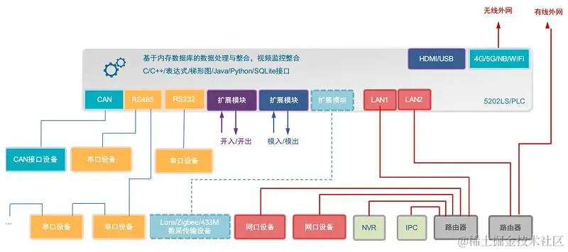 - 通过IEC61131-3编程语言,可针对网关内所有数据进行PLC方式编程,通过电气IO模块,实现轻量级PLC功能