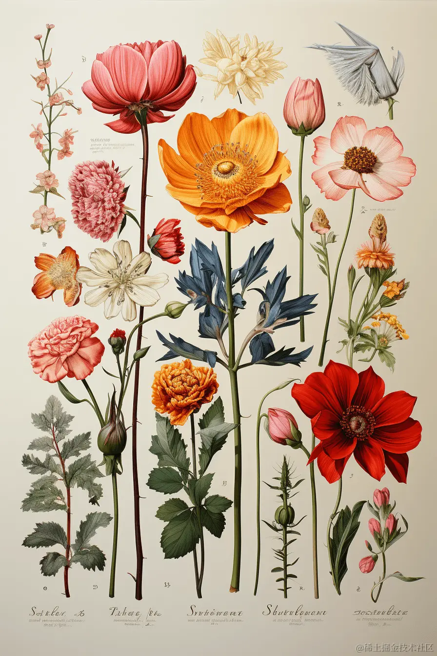Prompt: botanical illustration of flowers, knolling --ar 2:3 (植物花卉插图Knolling)