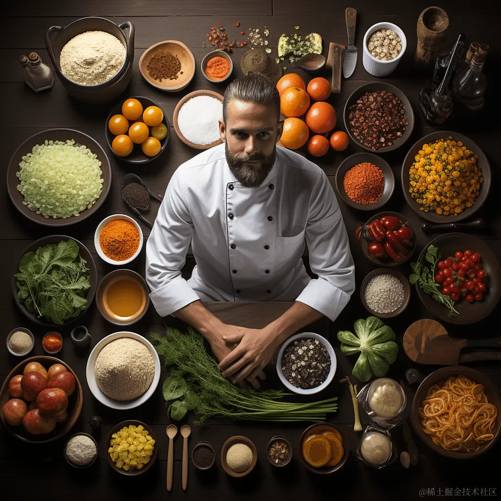 Prompt 1: flat lay photography of a chef in white uniform sitting cross-legged surrounded by ingredients (身着白色制服的厨师盘腿而坐,周围摆满食材的平面摄影作品)