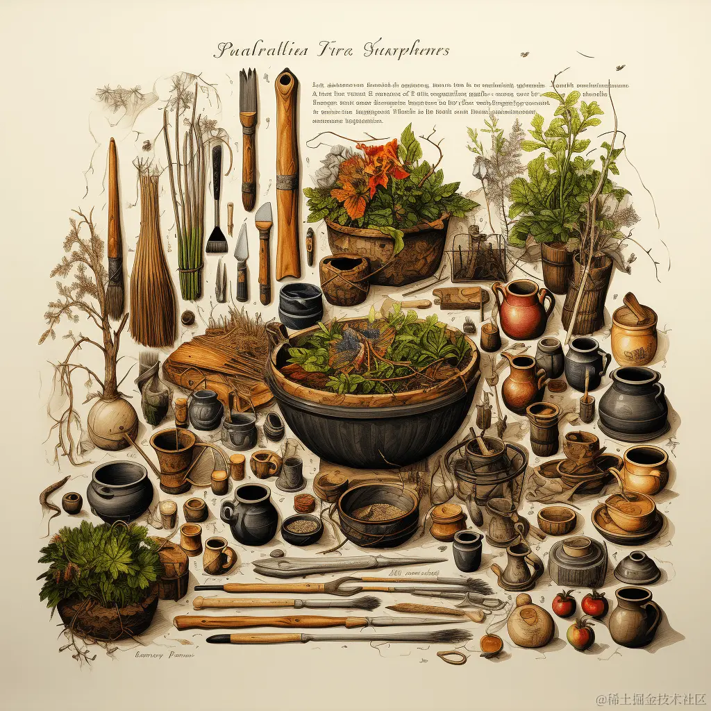 我在实践中发现,尽管 Knolling 是一种拍照方式,在 Midjourney 中你还可以指定其他的艺术媒介,比如信息图示 (infographic illustration),铅笔画 (pencil drawing),植物图鉴 (botanical illustration),技术插图 (technical Illustration),示意图 (diagrammatic drawing)。你甚至还可以使用动漫风格的 Niji 模型。真的非常有趣!