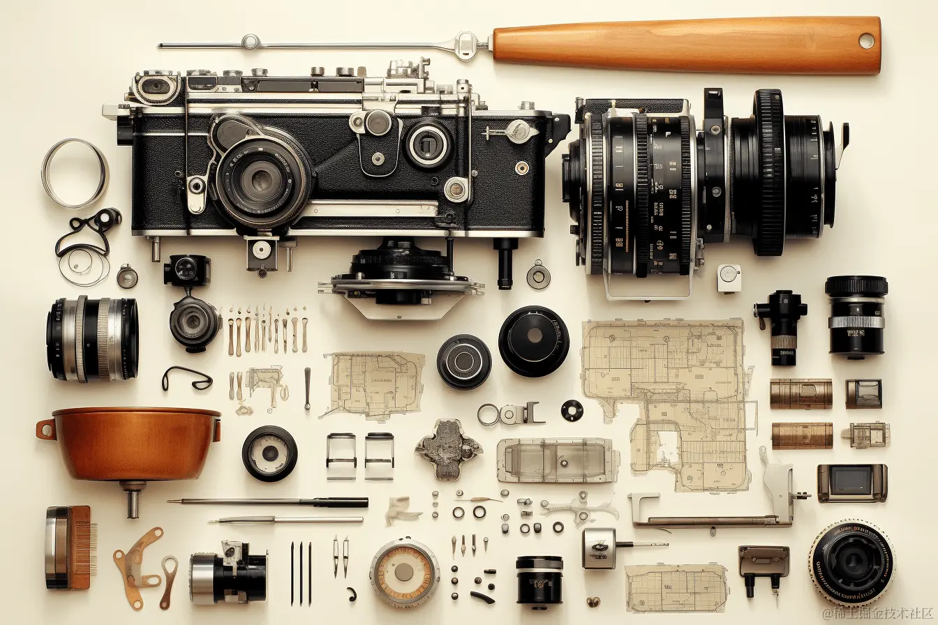 Prompt: technical Illustration of vintage camera parts, knolling --ar 3:2 (古董相机部件技术图解Knolling)
