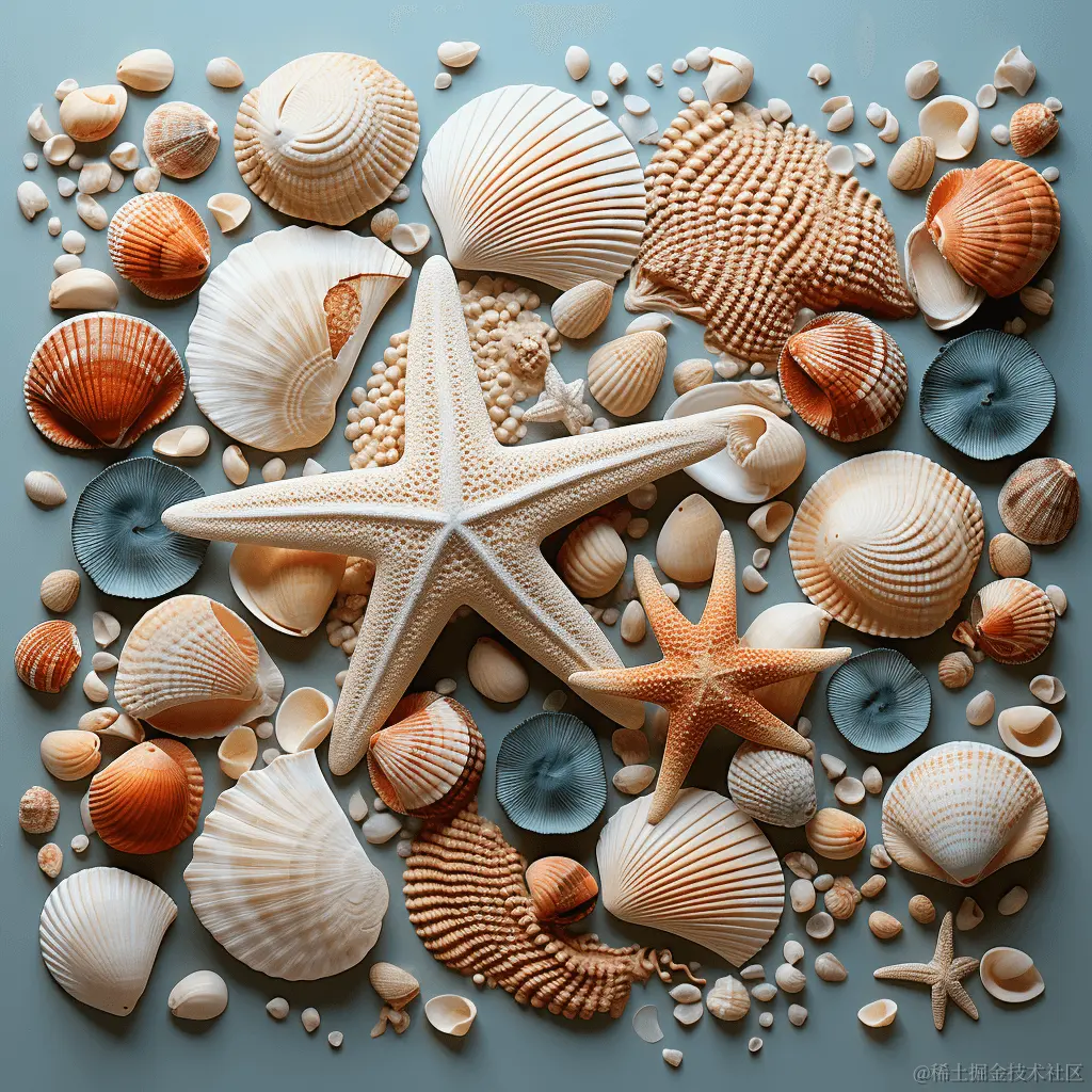 Prompt 1: array of seashells and starfish (贝壳和海星阵列)