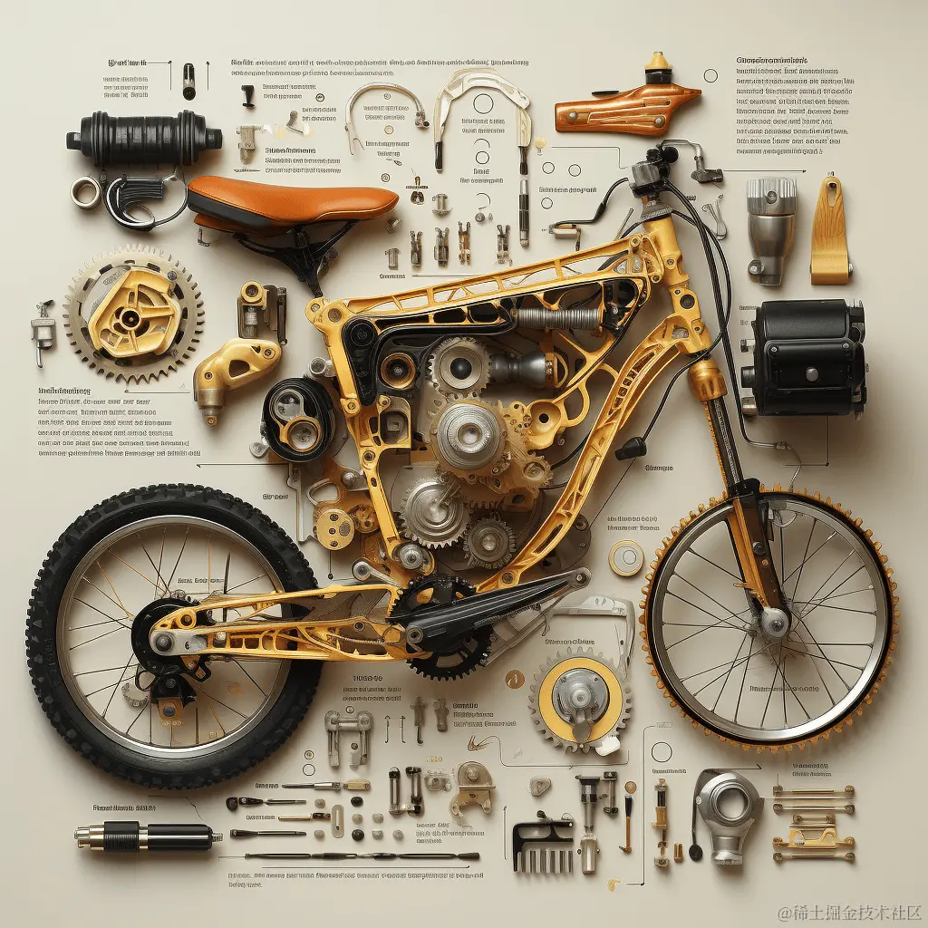Prompt: infographic illustration, knolling bike components (信息图表说明, Knolling 自行车组件)