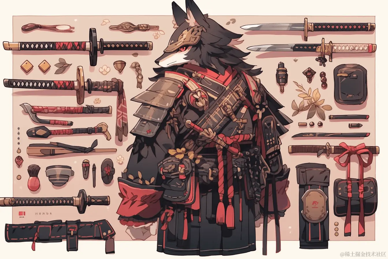 Prompt: knolling samurai warrior gear --ar 3:2 --niji 5 (武士装备Knolling)