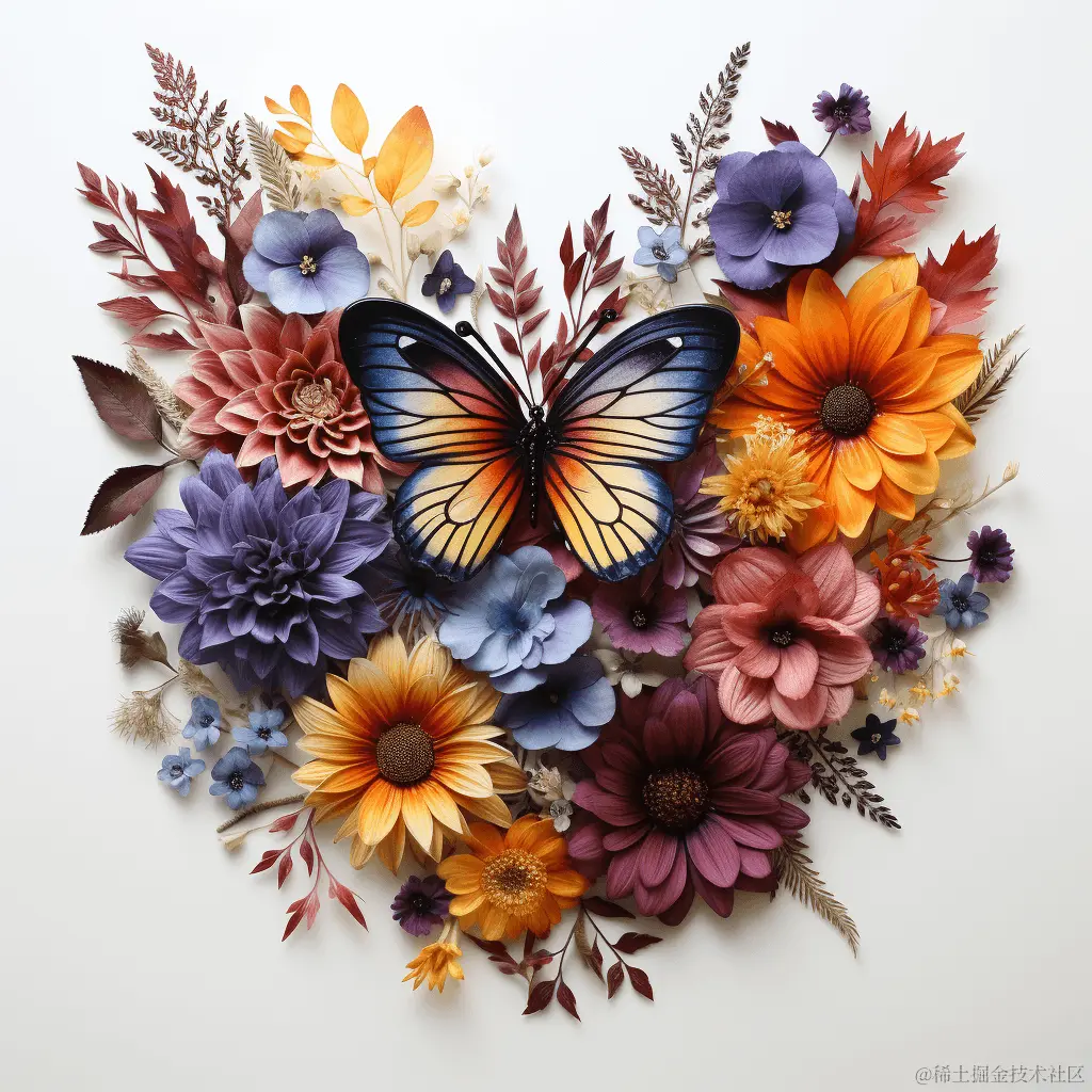 Prompt: flat lay colorful flowers, leaves, butterflies composed in a heart shape (平铺五颜六色的花朵、树叶和蝴蝶,组成一个心形)