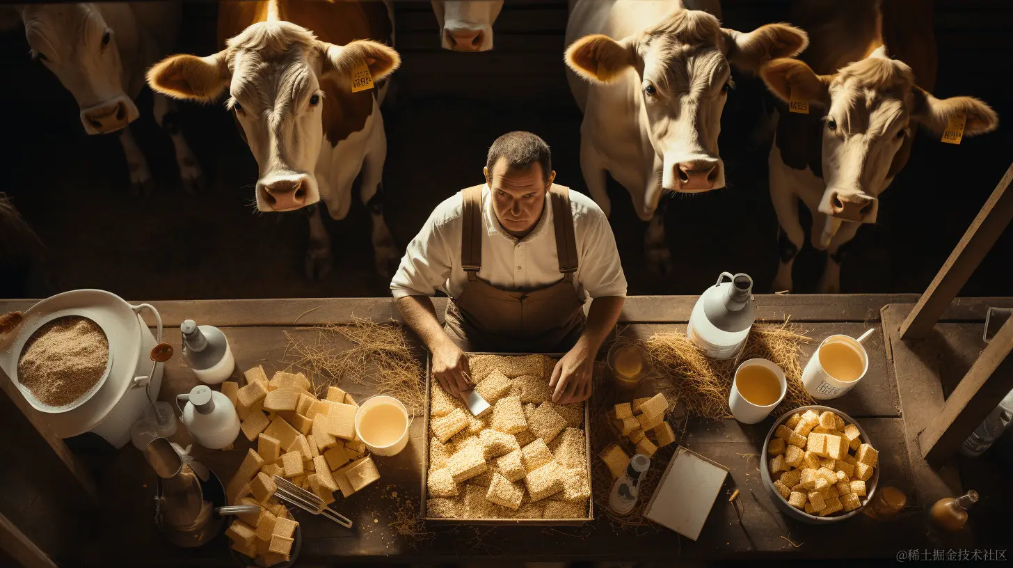 Prompt: flat lay aerial shot of a dairy farmer & cow relaxing in hay barn surrounded by milk pails, stools, butter neatly arranged --ar 16:9 (平铺鸟瞰拍摄奶农和奶牛在干草棚中休息,周围是整齐摆放的牛奶桶、凳子和黄油)