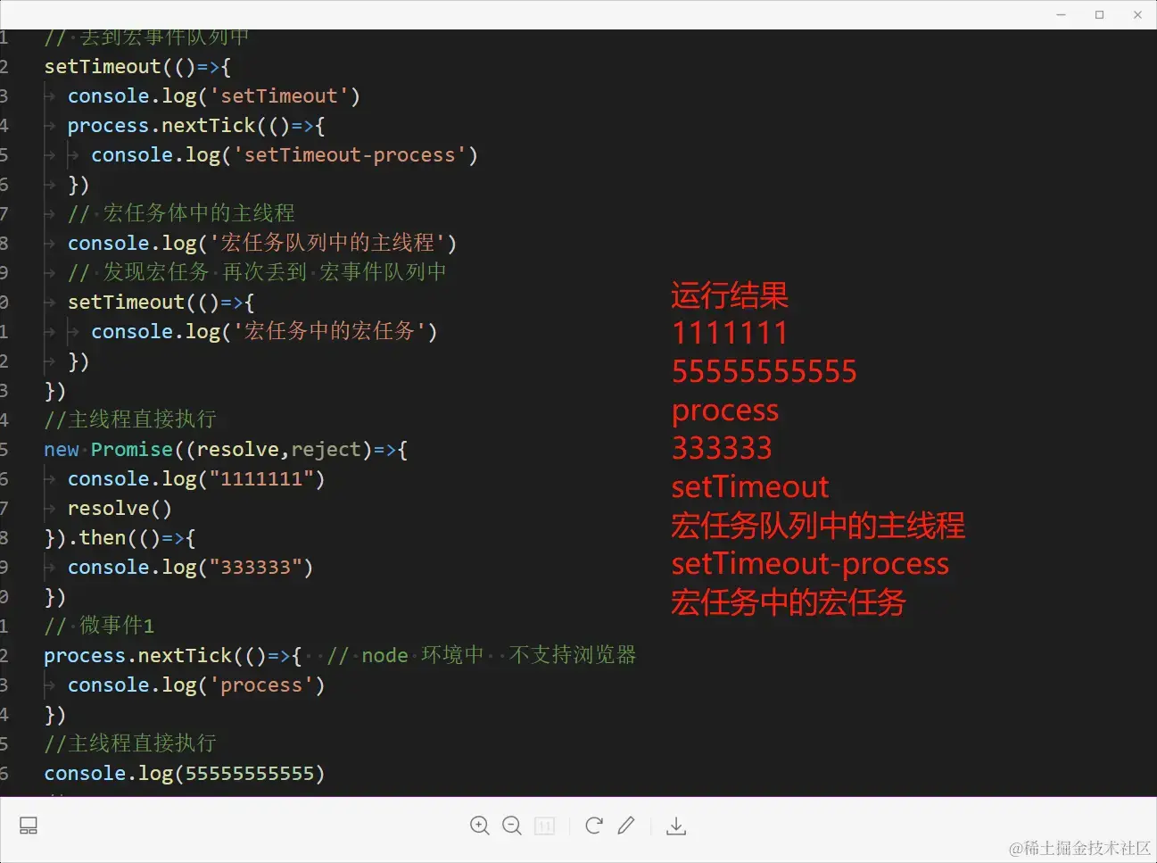 javascript的执行机制(宏任务和微任务) Grade_002 2023-09-20 64 阅读1分钟 首先以一个经典面试题开始 (for + setTimeout()) 涉及方面: 主线程 + 任务队列 (task queue) 常见的宏任务 setTimeout setInterval() 常见的微任务 Promise process.nextTick() 发现微任务优先执行 发现宏任务 丢入宏任务queue 中 执行如下图 闭包的使用场景