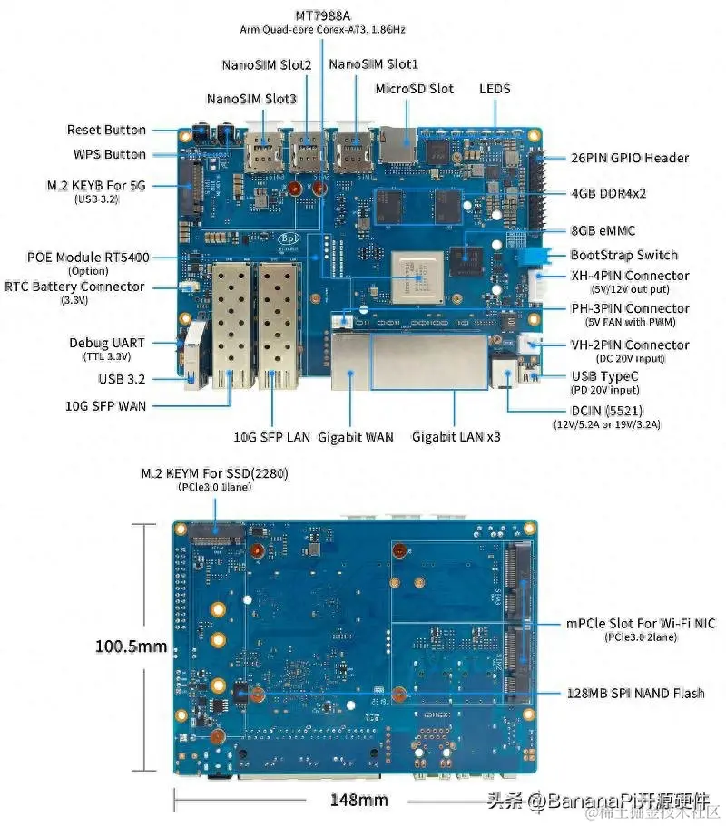 Banana Pi 发布了一款新的路由器板 Banana Pi BPI-R4,基于配备四核 Arm CPU 的 MediaTek MT7988A SoC。该板不仅仅是Raspberry Pi 的另一个替代品,而且是用于家庭网络和自动化的设备。