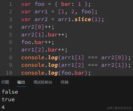 console.log(arr1[2] === arr2[1]); 中 arr1[2] 是 foo,也就是地址 A,arr2[1] 是 foo,也是地址 A,都是地址 A 所以输出 true。