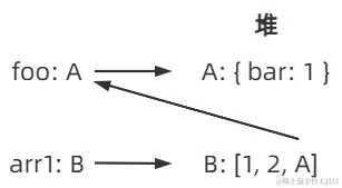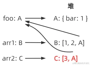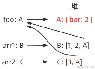 第二行是一个数组,数组也是一个对象,所以第二行和第一行类似,创建了一个数组对象 B: [1, 2, foo],数组的第三项 foo 其实就是地址 A,然后将数组赋值给变量 arr1: B