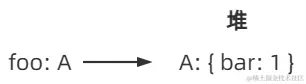 第一行代码做了什么事情呢?得分两步看,第一步 A: { bar: 1 } 创建了一个新对象在堆上,第二步将对象的地址赋值给变量 foo: A