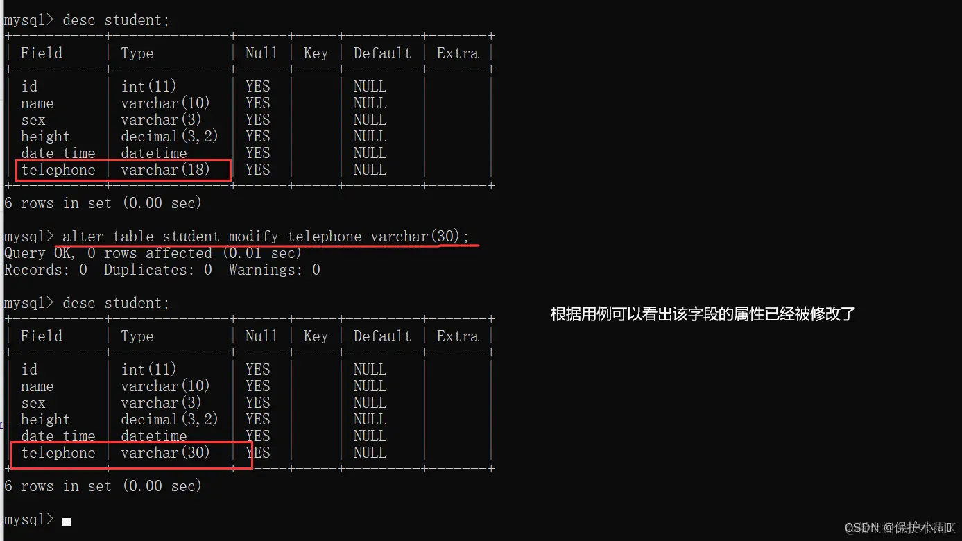 这个就很好理解了,删除某个字段(列名), 本次删除 telephone 字段。