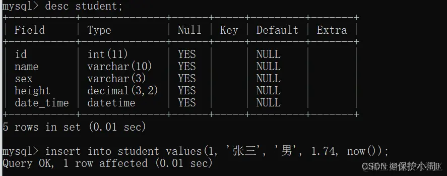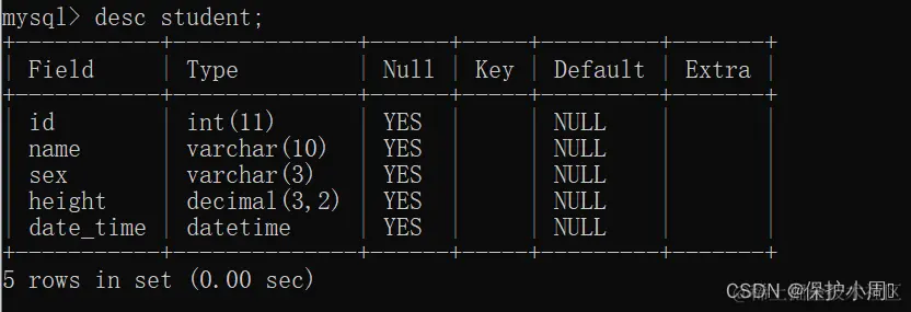 目前我们已经创建好了一个student 的数据表,接下来的操作是查看一下这个表的结构。