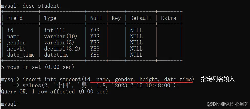 2.3.2 -- 不声明字段新增数据,必须把所有字段的值都写上