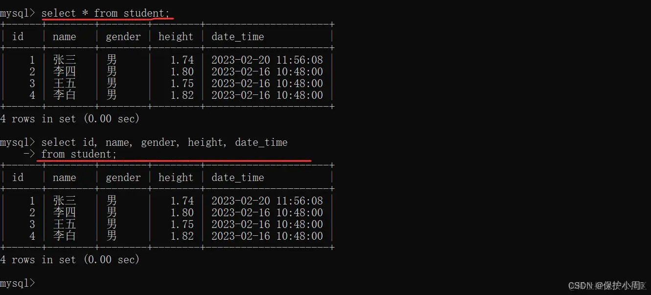 如果我们需要一次性查找所有的字段,其实不用讲所有字段全部列举出来,可以使用 ”*“ 来替代。