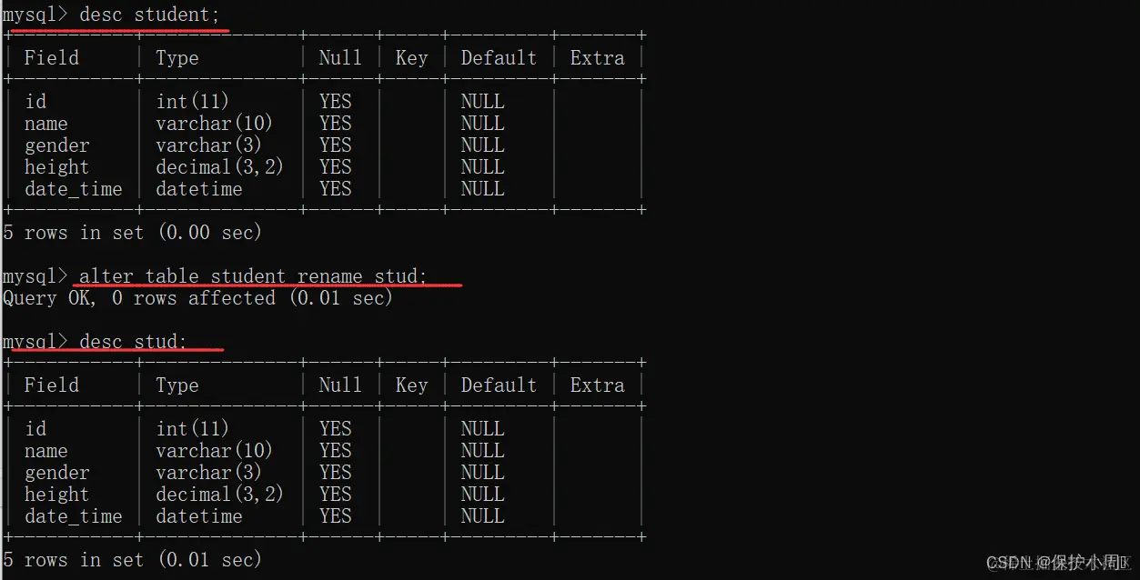 执行语句后表名已经被修改,以上操作,轻易不要操作,容易造成一系列的连锁反应(蝴蝶效应,动了一个表,可能需要修改多个表的数据,关系型数据库),在创建的时候就将表的结构计划好,尽可能的减少表结构的修改。