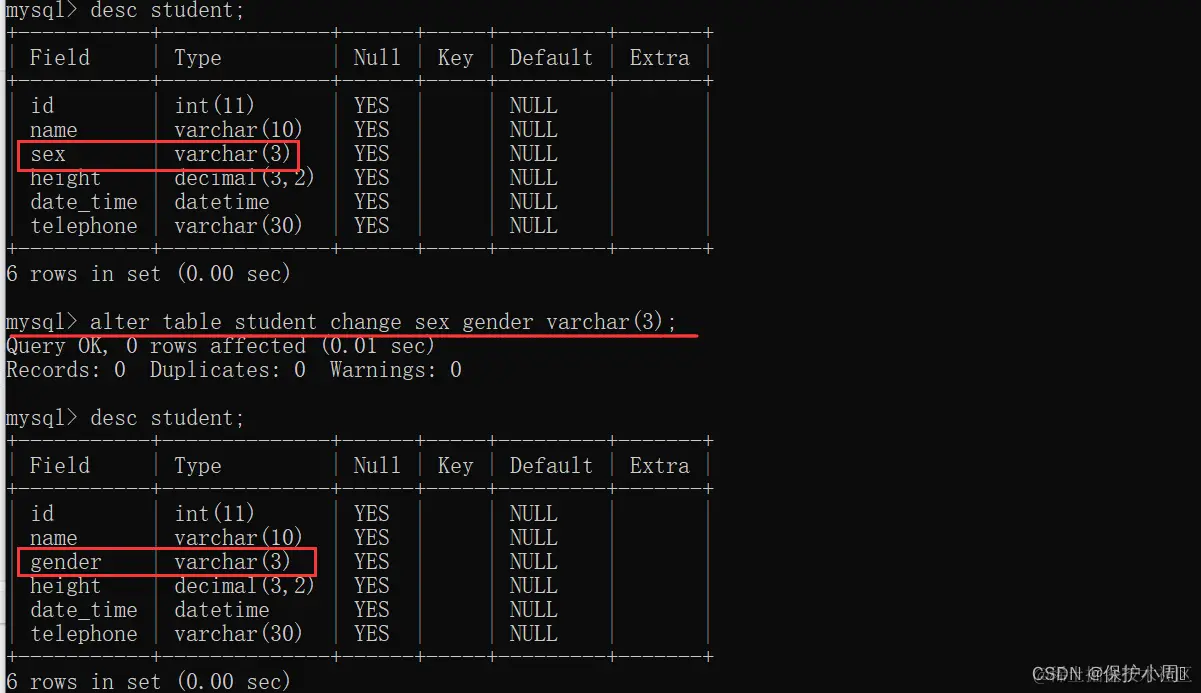 假如我们发现表中的某个字段的 字段名没取好名,也是可以修改的,例如将 sex 修改为 gender (性别)
