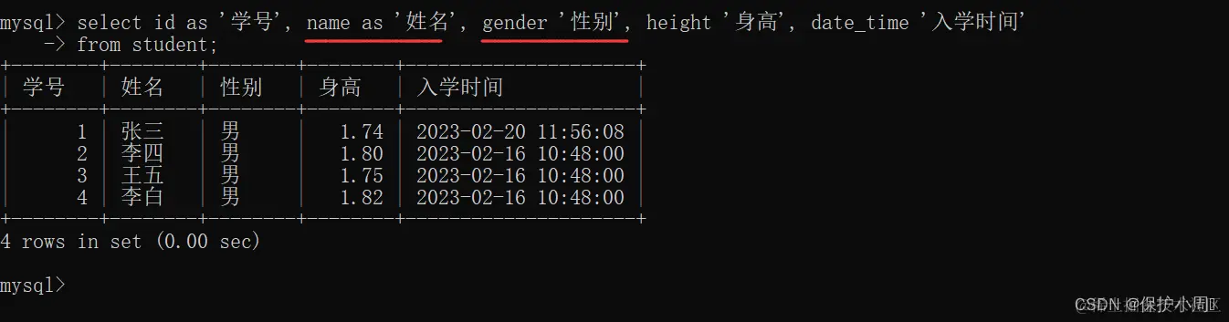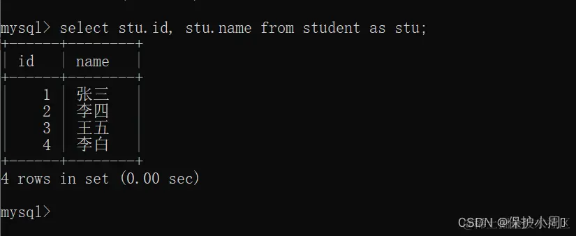 -- 别名可以简化字段或者表的名称,更精准的输入