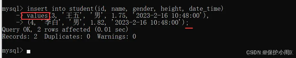 2.3.3 -- insert语句后面可以加多个VALUES,可以添加多个数据