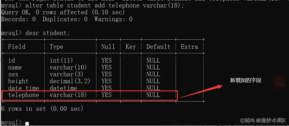 student 表 新增一个叫做 telephone (手机号)的字段,它的类型是可变字符串。