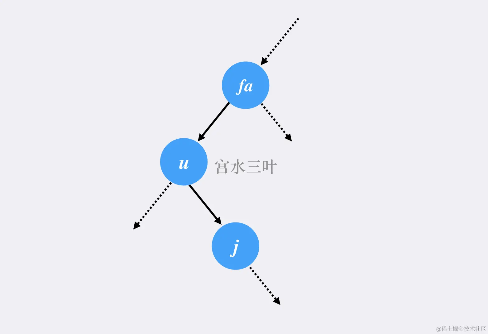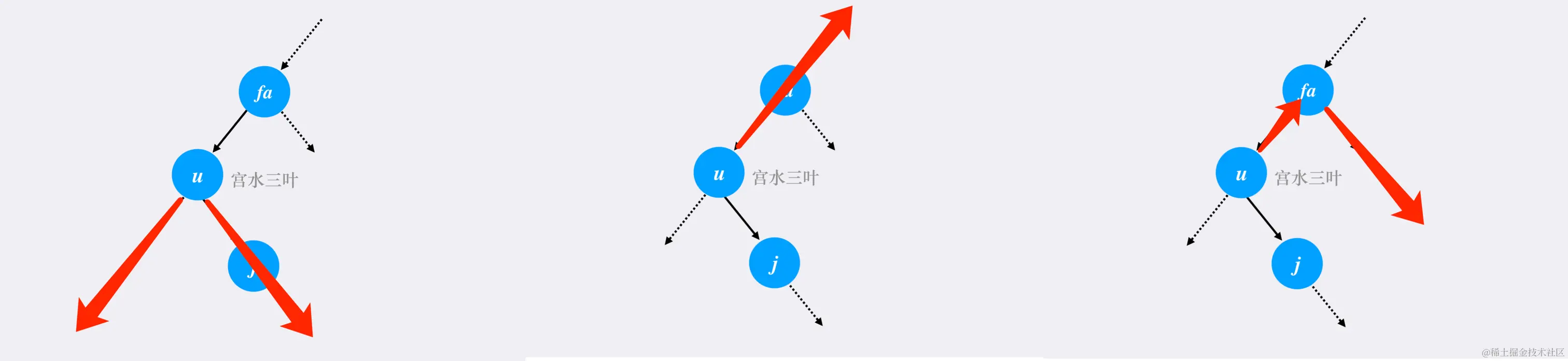 假设当前处理到的节点为 u,其是从父节点 fa 遍历而来,且将要遍历的子节点为 j。