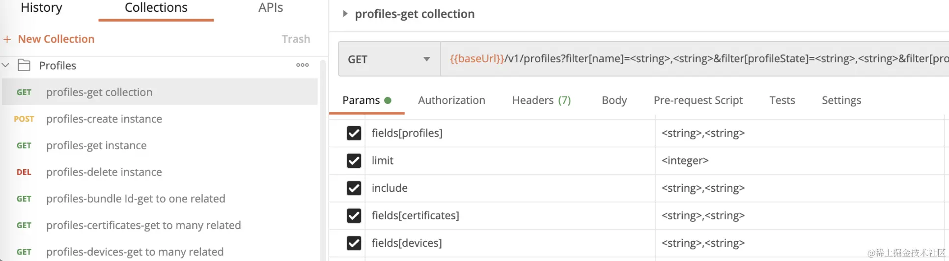 完整的开发API文件过于庞大(3M左右),而我们只需要管理套装ID(bundleId)、签名证书、开发设备和预置描述文件。因此对此API文件中的接口进行了缩减。只保留了与打包证书和描述文件相关的API。可以将以上OpenAPI规范文件通过Postman导入,更加直观的查阅和测试相关接口。