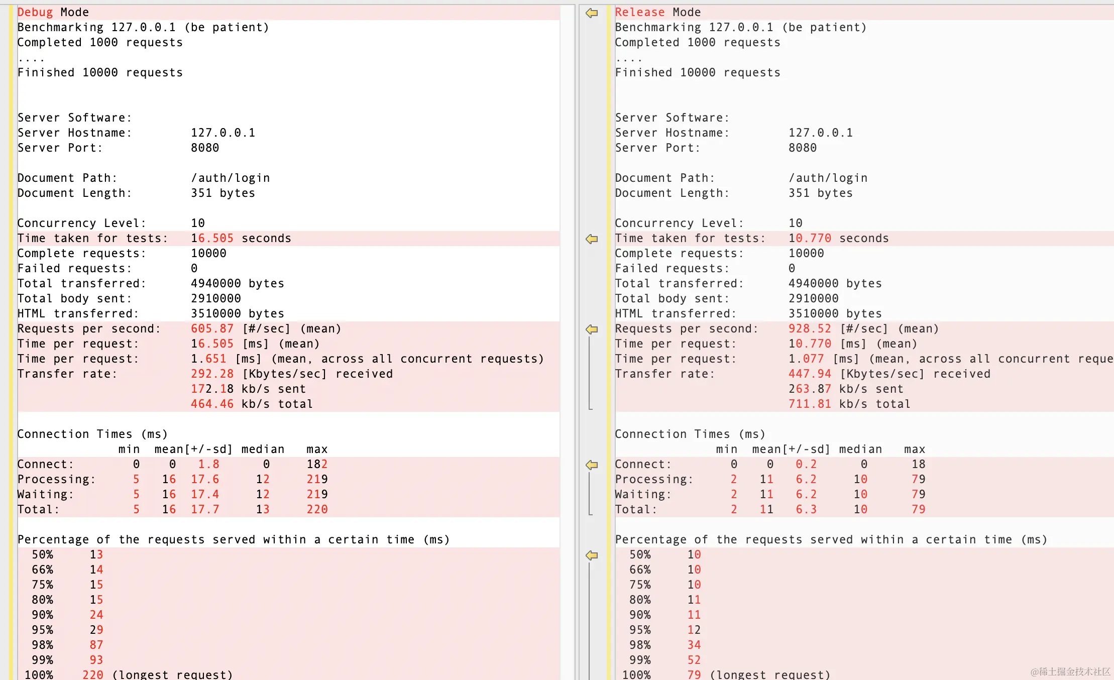 以上测试结果表示在Release模式下的平均响应时间在10毫秒,最长79毫秒。