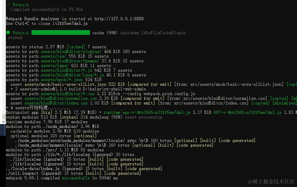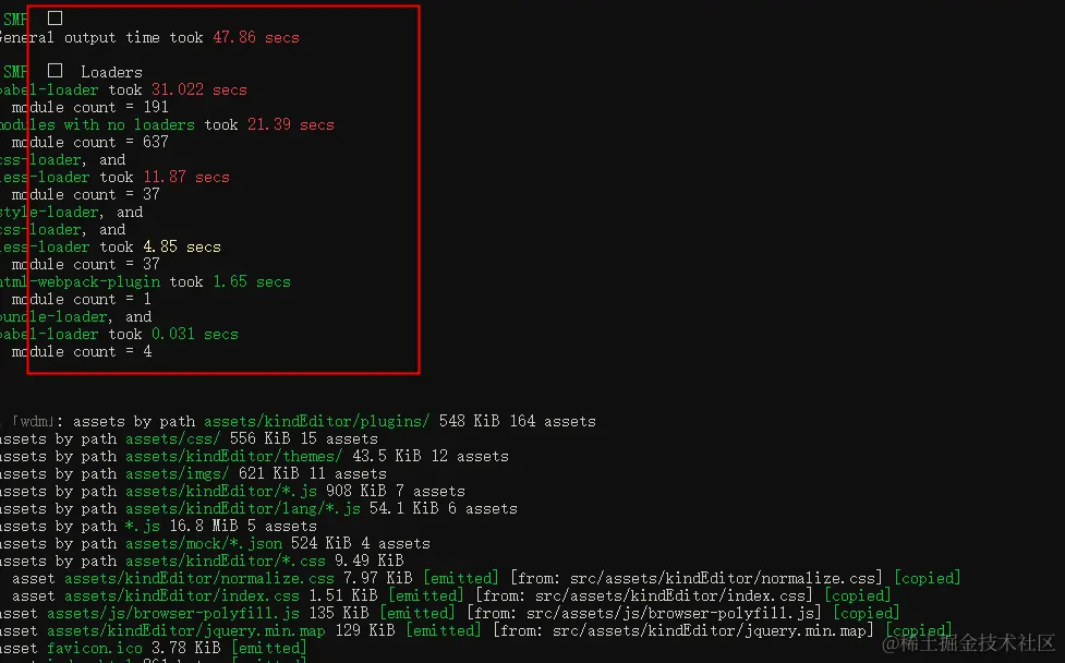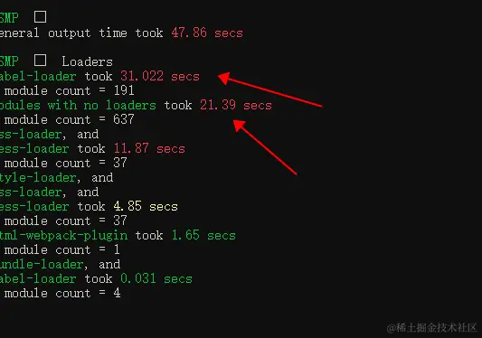 通过 speed-measure-webpack-plugin 插件进行构建速度分析,可以看到各个 loader、plugin 的构建时长,可针对耗时 loader、plugin 进行优化。