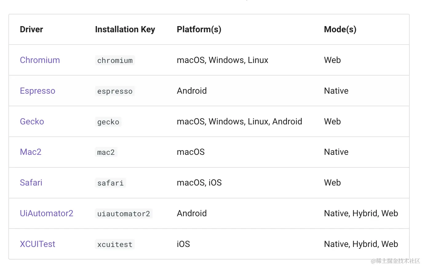 | Appium | Appium是一个开源的UI自动化测试框架,专门用于移动应用程序的测试。它支持多种移动平台,如iOS和Android,并提供跨平台的测试能力。 | 基于WebDriver 规范打造统一平台化能力,不仅仅支持iOS 和 Android,Appium 希望支持用户交互从 Web 到移动设备或从 Web 到电视不同的情况,提供了驱动的概念。 |