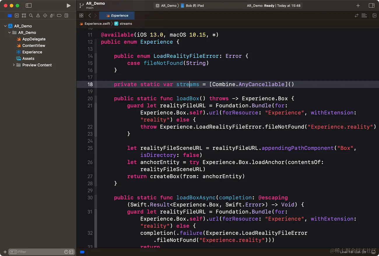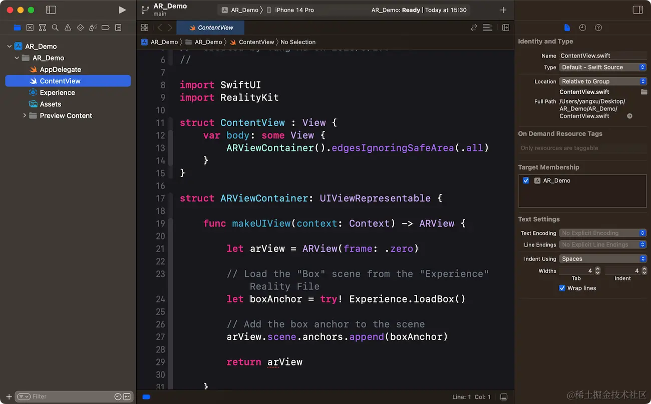 在 Xcode 中新建一个对增强现实应用程序项目,然后删除模板中的 Experience 文件。