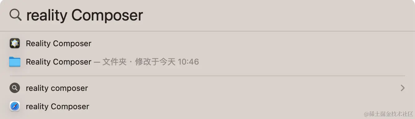在 macOS 上,Reality Composer 是集成在 Xcode 中的。只要你安装好 Xcode,就可以在 Spotlight 中搜索并直接打开它。