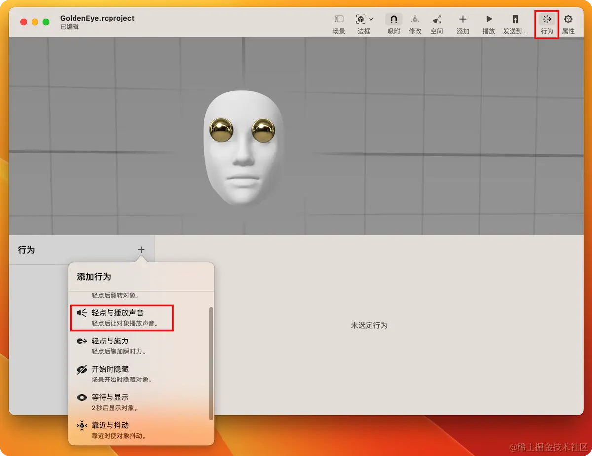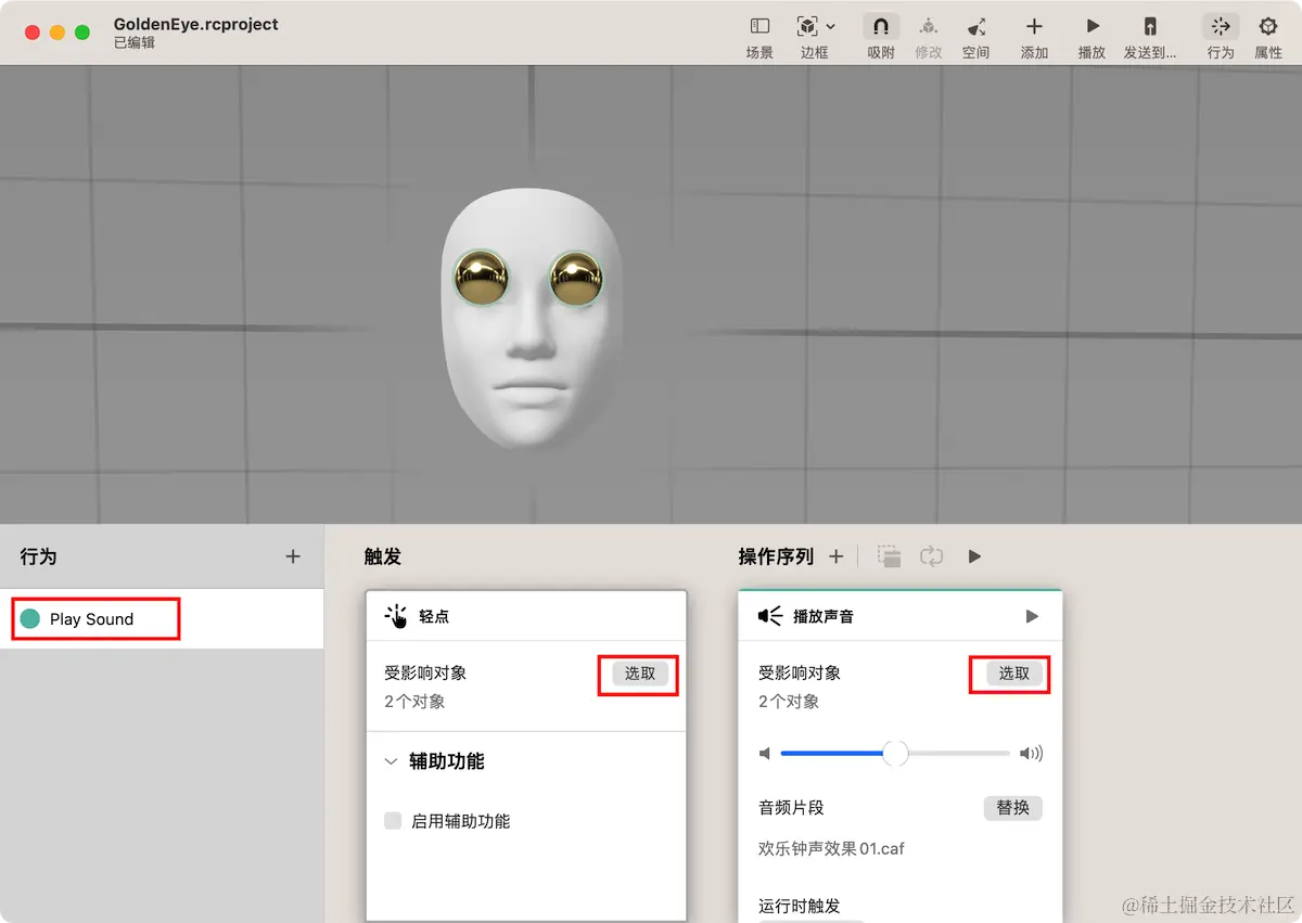 请将新增的行为命名为“Play Sound”。在“触发”栏中,点击“选择”按钮,选中两个金色的球体。在“播放声音”栏中,点击“选择”按钮,同样将两个球体设置为受影响的对象。最后选择你喜欢的音频片段。