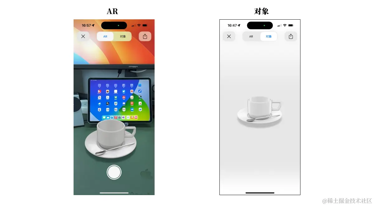 现在,我们将注意力转移到 AR QuickLook 的交互界面。在界面中央有一个切换按钮,上面分别写着“AR”和“对象”, 它们分别代表什么呢?