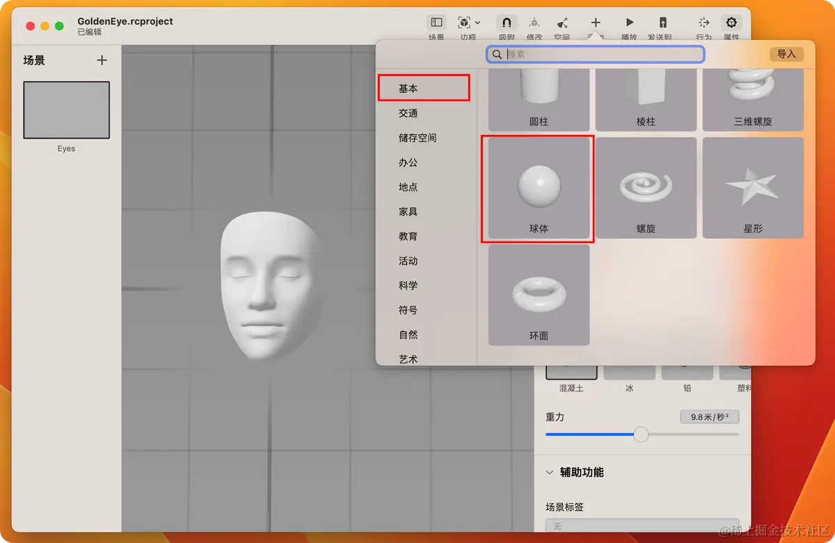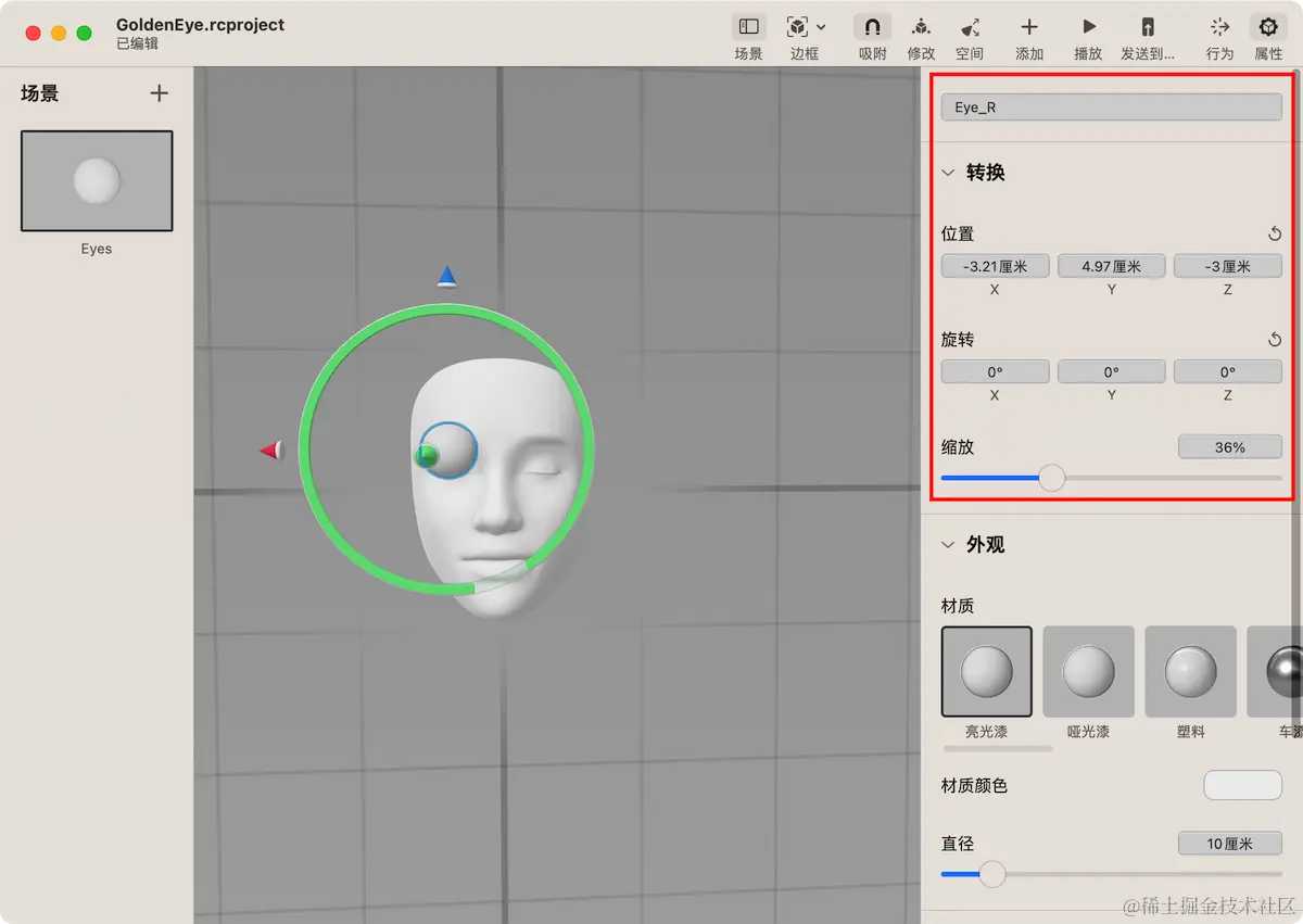 你可以通过鼠标或手势对球体进行缩放并放置到右眼附近,或者在右侧的属性栏中为球体设置具体的位置和尺寸信息。别忘了给球体命名为 “Eye_R”。