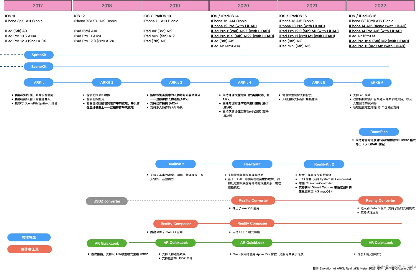 2017 年可以说是 Apple AR 的“元年”。在这一年的 WWDC 上,Apple 发布了 ARKit 框架,以帮助开发者在 Apple 生态下进行 AR 应用的开发。发布之初,ARKit 提供了可以识别平面以及跟踪设备移动情况的能力。这两项能力是基于计算机视觉框架 Vision 对摄像头数据和 iOS 设备的陀螺仪传感器实现的。尽管基础,但这两个功能已经为 AR 应用的开发打了坚实的基础。