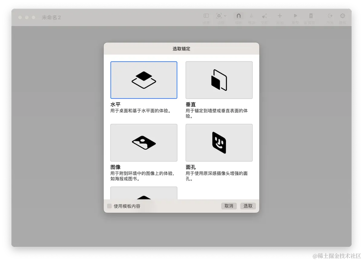 在新建 Reality Composer 项目时,应用会要求我们为第一个场景选择锚定类型(Anchor)。