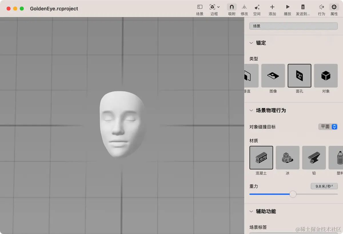 面孔类型允许你将内容放置在检测到的人脸上或附近。选择此锚定类型时,Reality Composer 将显示一个 3D 人脸来替代 ARKit 检测到的真实世界中的人脸。