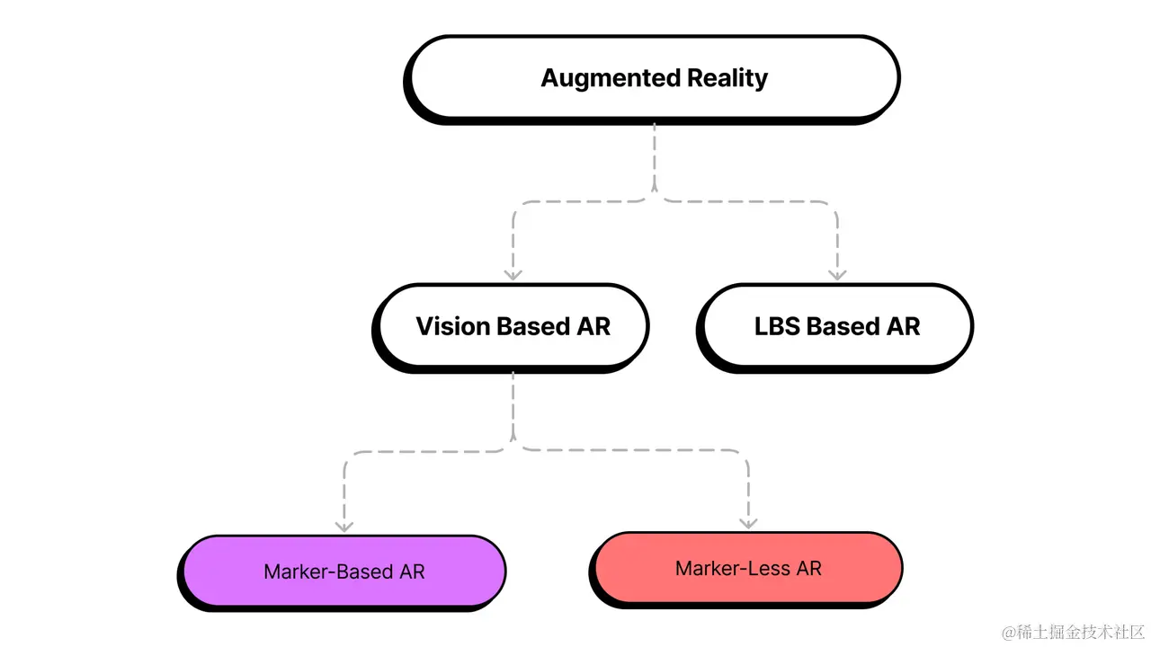 Vision Based AR 分为基于标记的 AR(Marker-based AR) 和无标记的 AR(Marker-less AR) 两种。Marker-based AR 实现简单,现实感稍微差点,显示内容也受那些小标记的限制。譬如之前展示的那个初音未来的视频,它就是基于 Marker-based AR 的原理实现的。另一种 Marker-less AR 需要计算机视觉和机器学习技术的支持,它会建立一个超级详细的三维环境模型,然后基于这个模型进行定位、跟踪和显示内容。相比而言,Marker-less AR 可以达到更高的现实感,显示内容也更加精细。