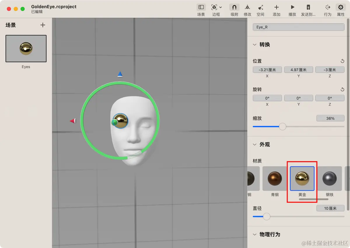 在选中球体(Eye_R)时,切换到材质栏并选择黄金材质。